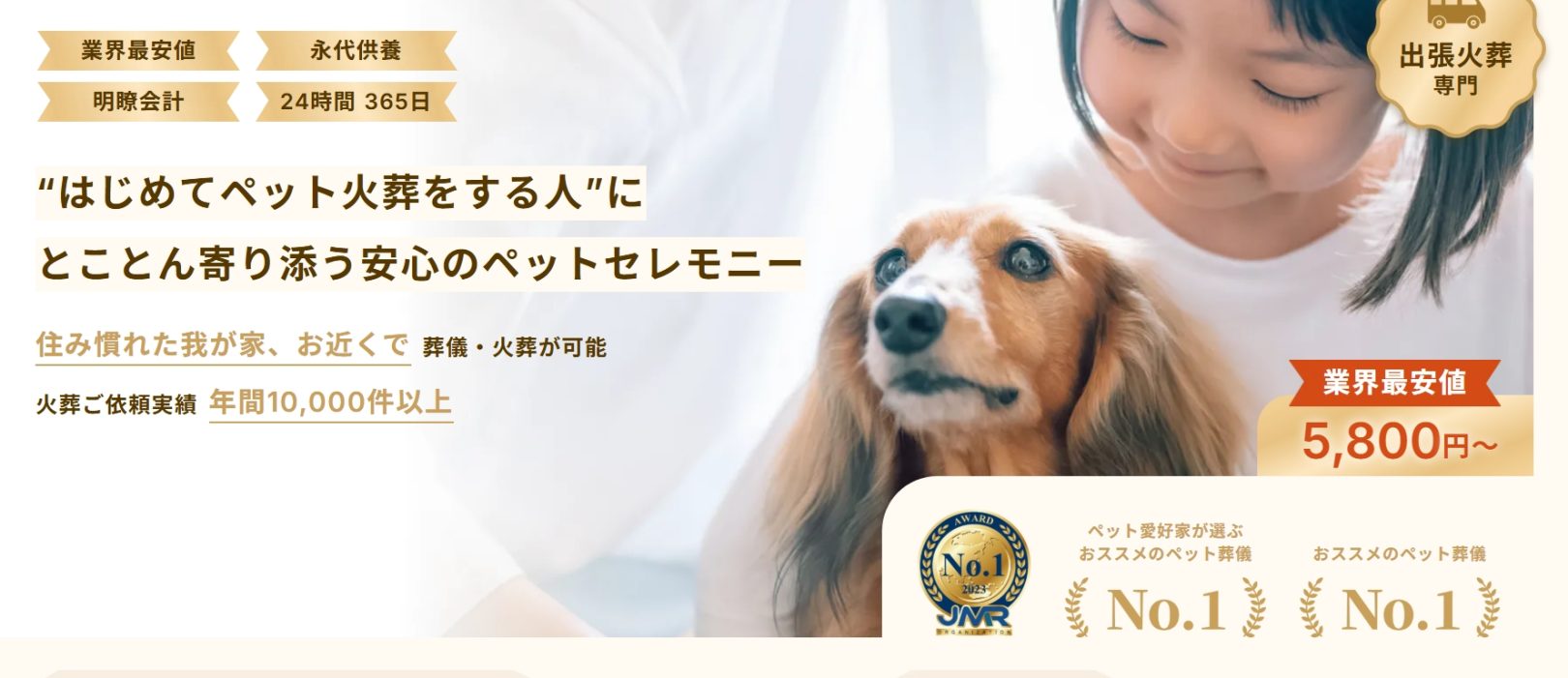 小動物から大型犬・特大犬まで対応し、明確料金・親身な対応で安心して相談できるペット葬儀サービスを案内しています。