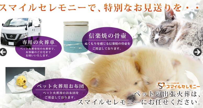 愛知県小牧市を拠点に、愛知・岐阜エリアへ対応する訪問型ペット火葬サービス「スマイルセレモニー」。専用火葬車で自宅へ訪問し、個別火葬・立会火葬などご家族の希望に合わせたお見送りが可能です。