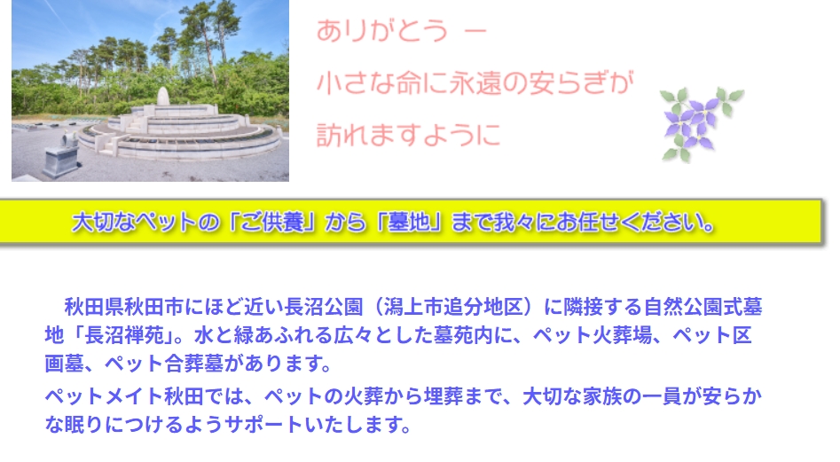 長沼禅苑 ペットメイト秋田は秋田県潟上市の自然公園式霊園内にあるペット火葬・供養サービスです。