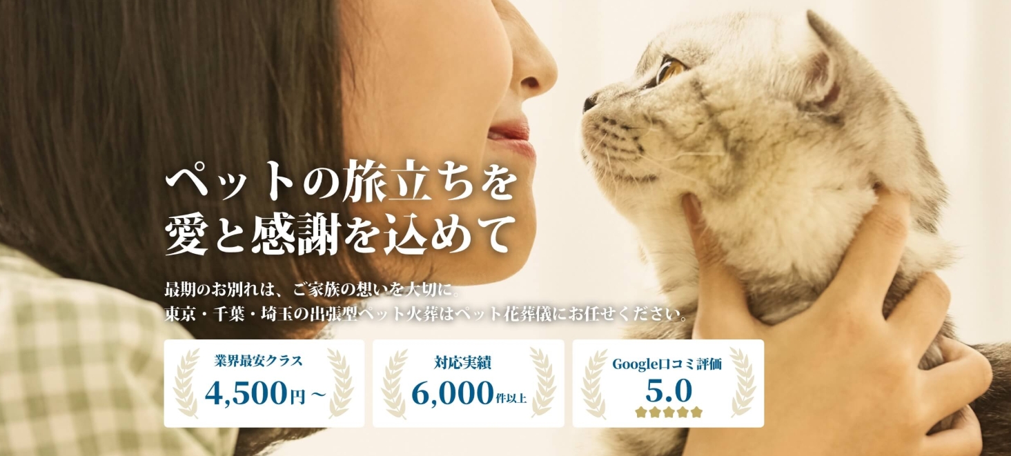 東京・神奈川・千葉・埼玉を中心に、訪問火葬でお見送りを行うペット葬儀専門サービス。