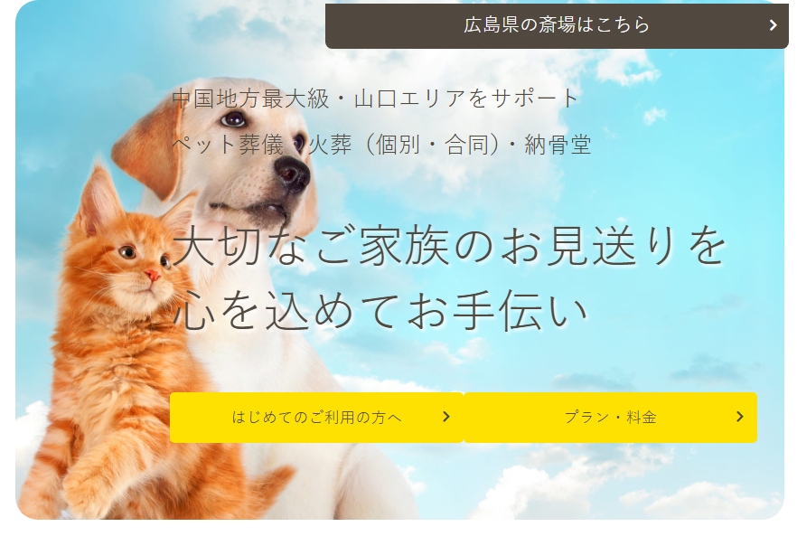 山口県岩国市・周南市・田布施町に斎場を持ち、葬儀・火葬・納骨まで対応する総合ペット葬祭サービスです。
