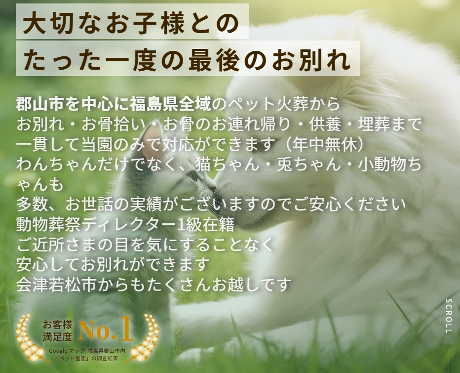 郡山動物霵園 うねめの杜は、福島県郡山市を拠点にペットの火葬・葬儀・埋葬・供養まで一貫対応するペット霊園サービスです。