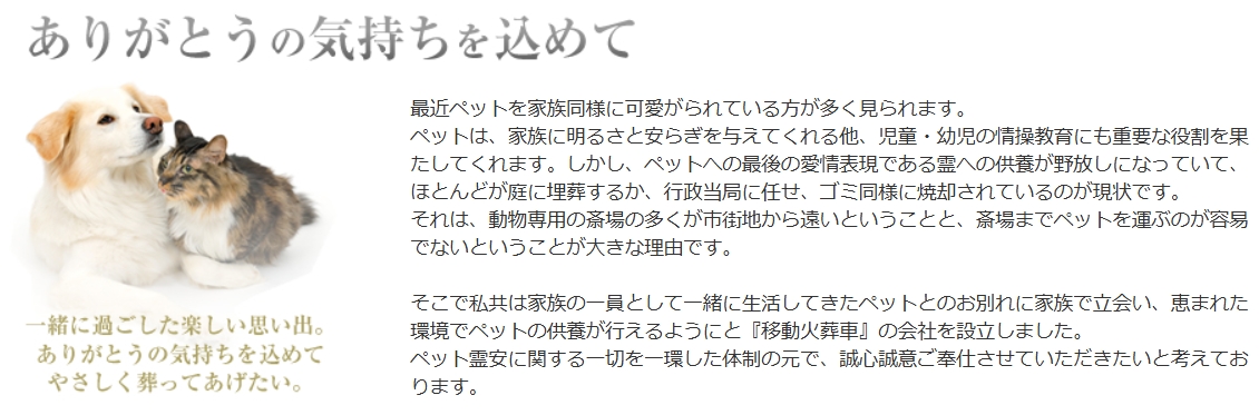 ジョイフルエーケーのペット専門店が行う訪問ペット葬儀として、移動火葬車でご自宅や指定場所へ伺い、個別火葬を心を込めて丁寧にお手伝いします。