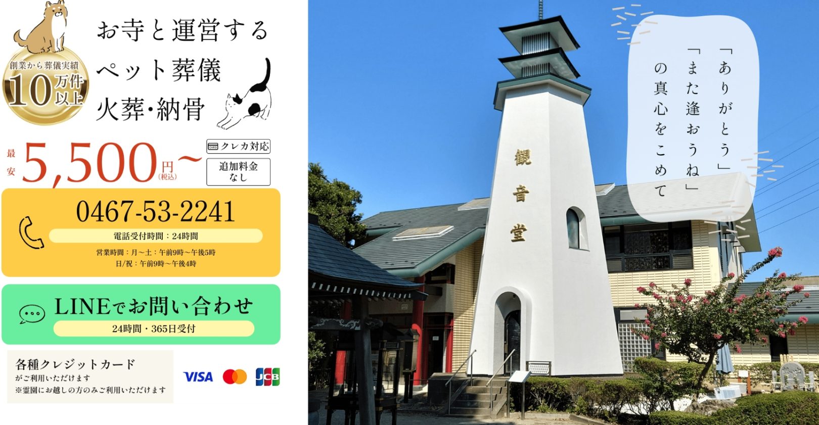 犬や猫をはじめ幅広いペットの立会葬・個別葬・合同葬に対応し、納骨・供養・法要まで一貫して案内しています。