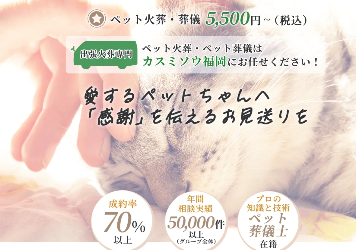 福岡市を拠点に、ご自宅や思い出の場所へ訪問訪問しながらペットの葬儀・火葬を真心込めてお手伝いする専門サービスです。