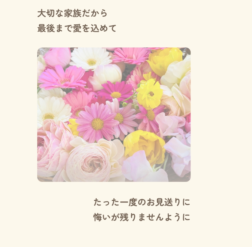 お見送り前のご相談からメモリアルグッズ・納骨・法要まで、ご家族の想いに寄り添います。