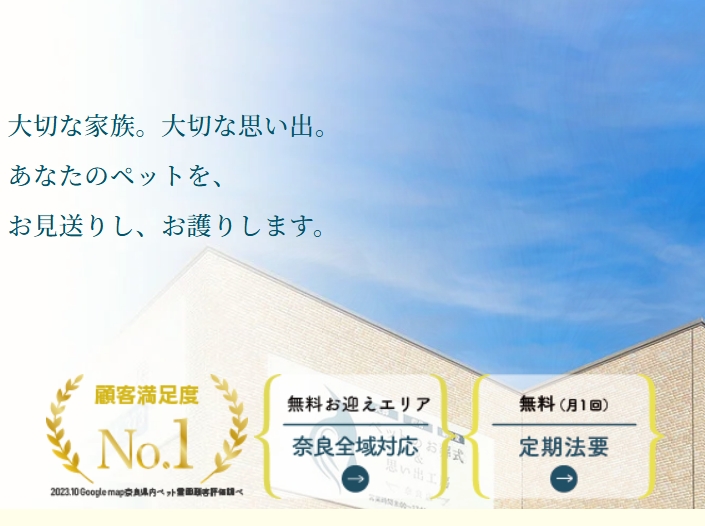 奈良市にある都市型総合ペット霊園「ペットのお葬式&思い出工房」。火葬・葬儀会館・納骨堂を備えた奈良市内最大級のペットメモリアル施設です。