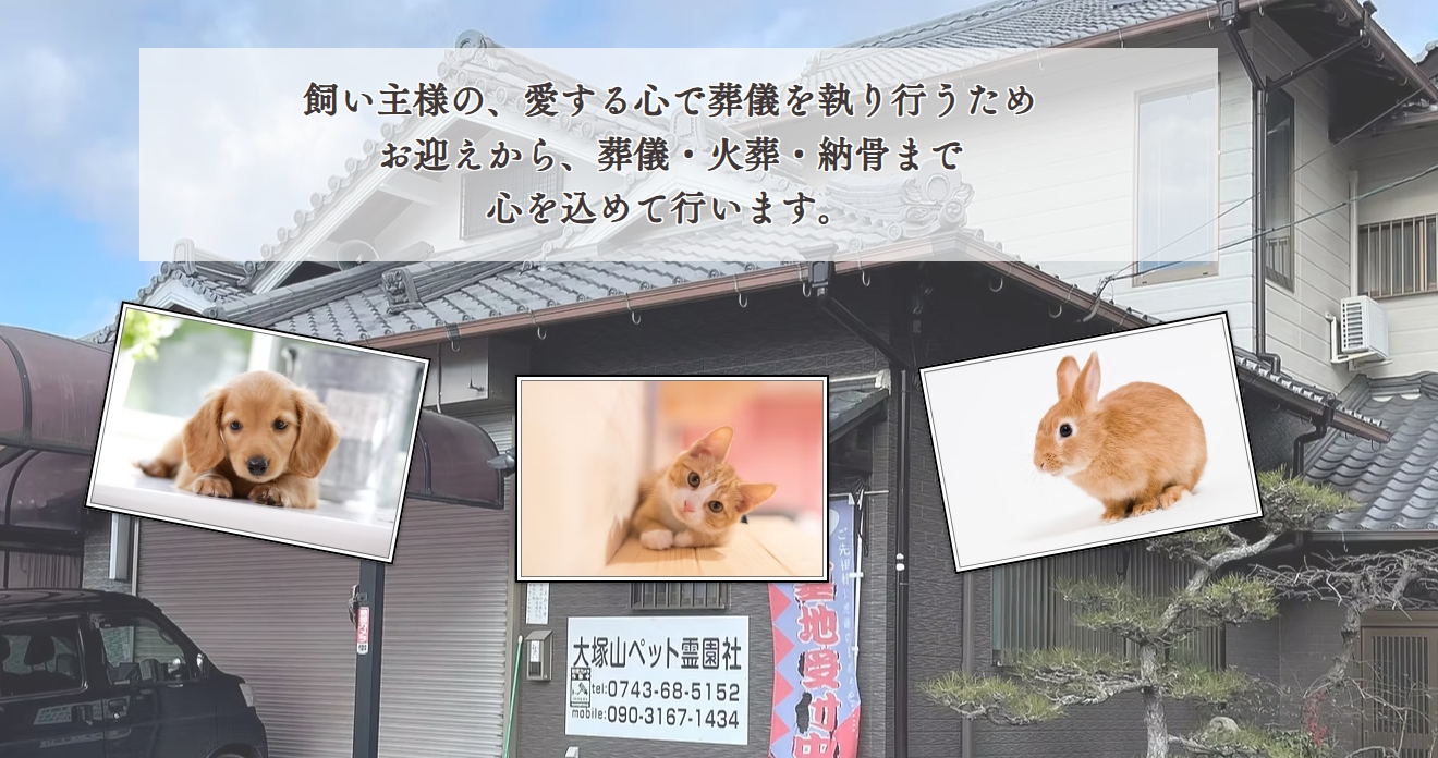 奈良県天理市の自然豊かな環境にある「大塚山ペット霊園社」。お迎えから葬儀・火葬・納骨まで一貫して対応し、丁寧なお見送りをサポートしています。