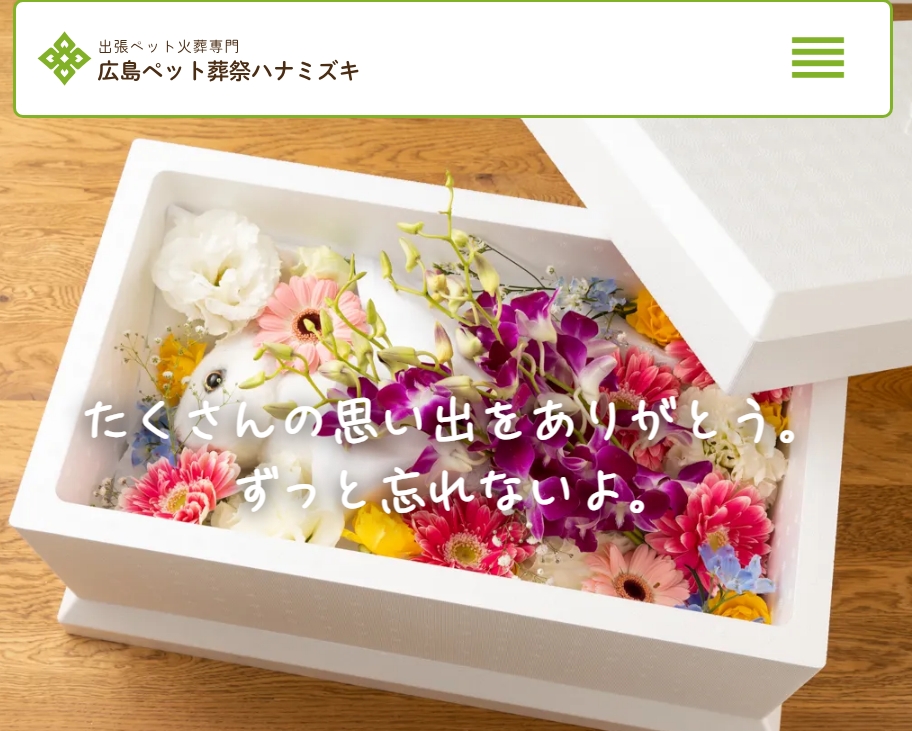 「ペット葬祭ハナミズキ 広島」は広島市・廿日市・呉・安芸・三原など広島県内に対応する訪問ペット火葬サービスです。