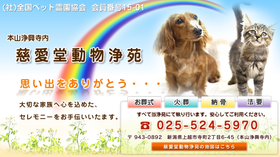 慈愛堂動物浄苑は新潟県上越市の本山浄興寺内にあるペット専用の火葬・葬儀・供養施設で、ご家族立会いの個別火葬を中心に大切なペットとの最期のお別れを丁寧にサポートします。
