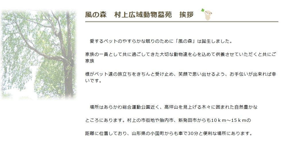風の森村上広域動物墓苑は新潟県村上市の自然豊かな環境にあるペット専用霊園で、すべて個別火葬にて大切なペットのお別れを丁寧にサポートします。