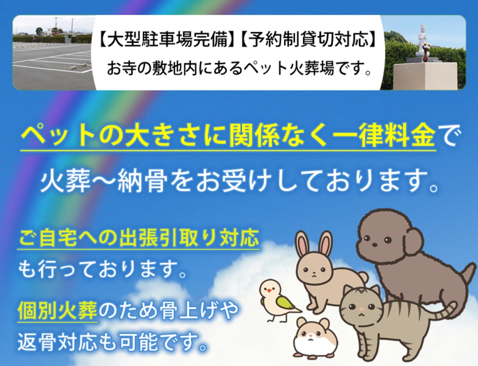 佐賀県小城市の「ペット霊園 メモリーランド」で、愛するペットの火葬・葬儀・供養を心を込めてお手伝いします。