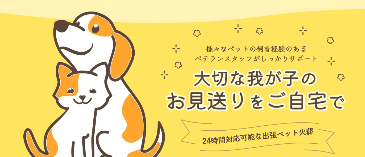大切なペットとの最期のお別れを心を込めてお手伝いする出張ペット葬儀・火葬サービスを案内しています。24時間365日対応で、ご自宅やご希望の場所へお伺いし個別火葬・立会火葬・あずかり火葬など多彩なプランを提供しています。