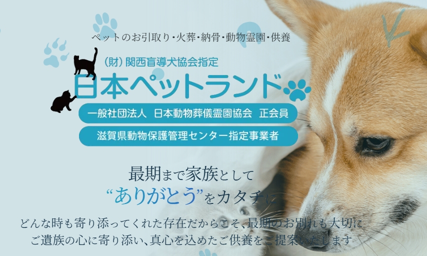日本ペットランドは、昭和56年の創業以来、滋賀県大津市を拠点にペット葬儀・ペット火葬・納骨・供養まで一貫して行う専門サービスです。