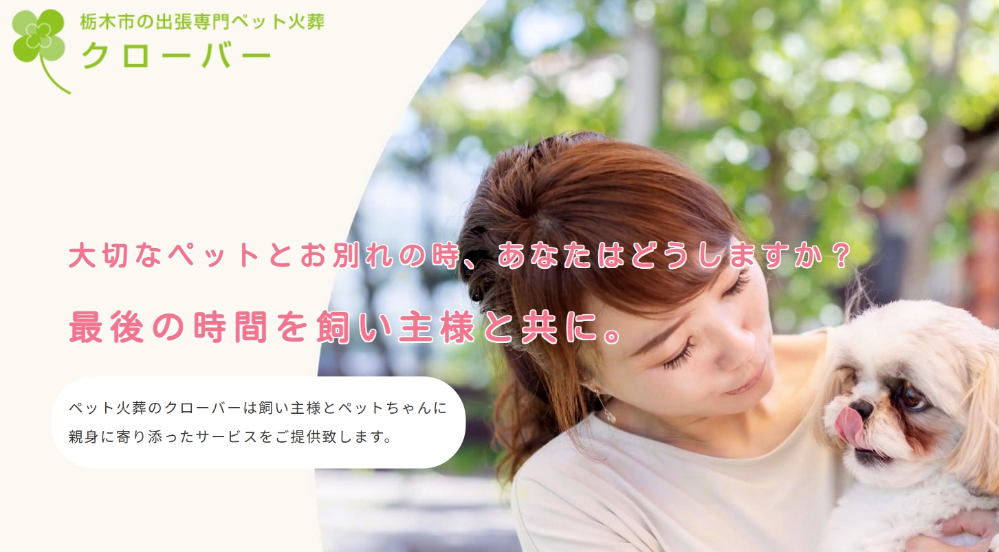 ペット火葬 クローバーは栃木県栃木市を拠点に、女性スタッフが訪問火葬車でご自宅やご希望の場所まで伺い、大切なペットとの最後のお別れを丁寧にサポートする出張型ペット火葬サービスです。