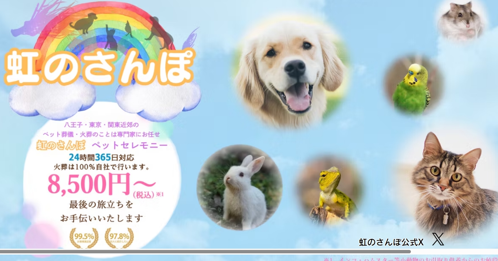 虹のさんぽ(Airindo ペット葬儀サービス) は、東京都八王子市を拠点に訪問ペット火葬・葬儀を関東全域で提供し、丁寧なお別れをサポートするサービスです。