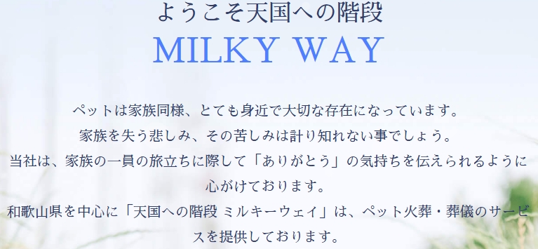 和歌山県全域に対応するペット火葬・葬儀サービス「天国への階段 MILKY WAY」。和歌山最大級の火葬施設を備え、個別火葬・合同火葬など希望に沿ったお見送りが可能です。
