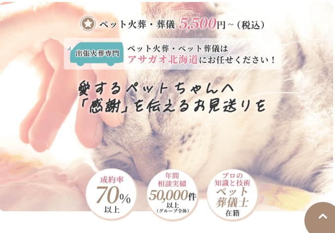 北海道全域に出張対応する「ペット火葬 アサガオ北海道」は、24時間365日受付で犬・猫から小動物まで幅広く火葬・葬儀をサポートします。