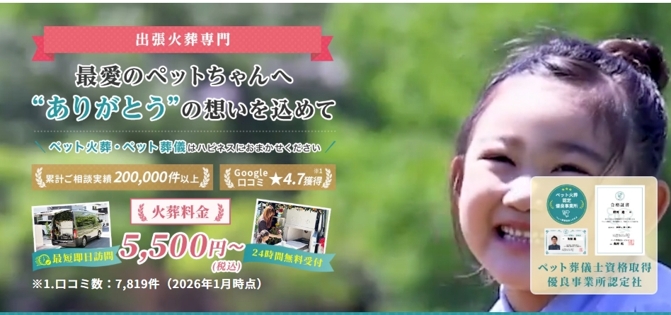 ペット火葬ハピネスは、高性能火葬車で21,000件以上の実績を持つ出張ペット火葬サービスで、札幌から全国対応しています。
